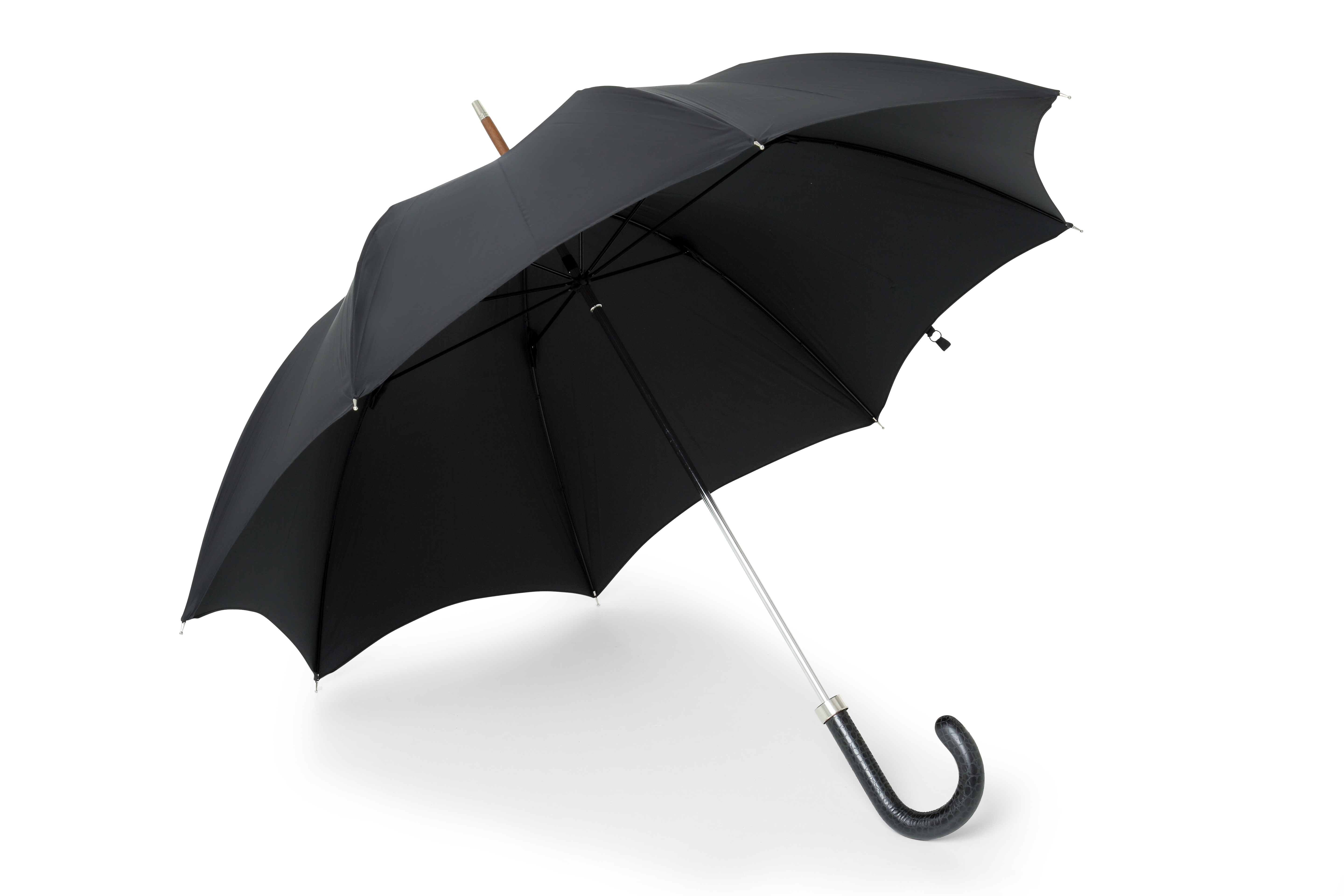 The black calf leather used for the making of this handle is pressed to achieve a look similar to crocodile skin. The polyester cloth used for the umbrella cover achieves an attractive traditional umbrella shape when open and rolls neatly when closed. Handmade using the strongest materials available, this umbrella is a trusted companion that will keep you dry for years to come. This umbrella comes complete with a case that the umbrella can be kept in when not in use.