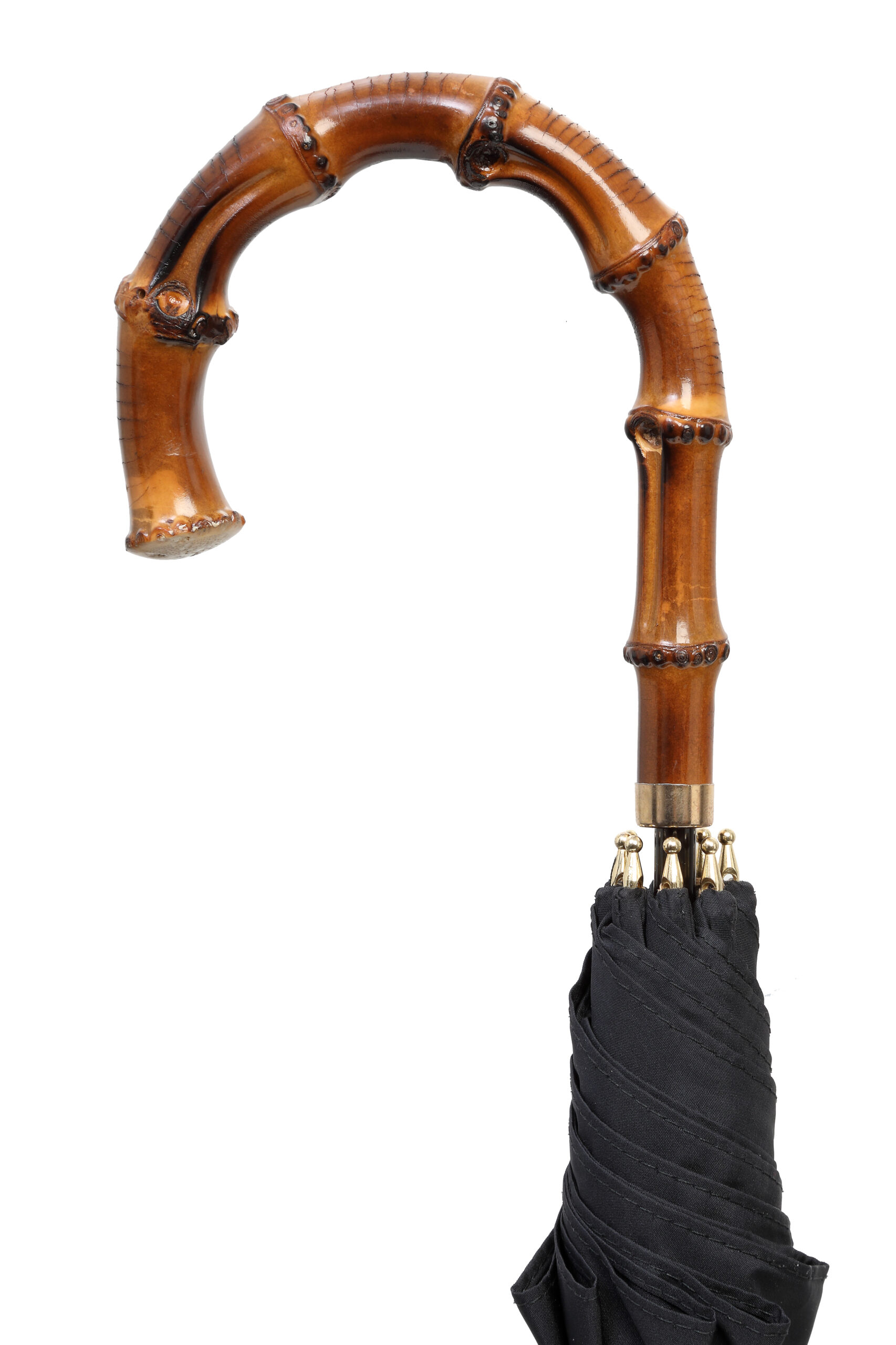 Long associated with British umbrella making, the Whangee crook is the most traditional handle of them all. The Japanese cane is lightly scorched to achieve a desirable contrast that emphasises the natural beauty of the Asian grass. These smaller-sized handmade ladies umbrellas are convenient, lightweight, strong and distinctive.