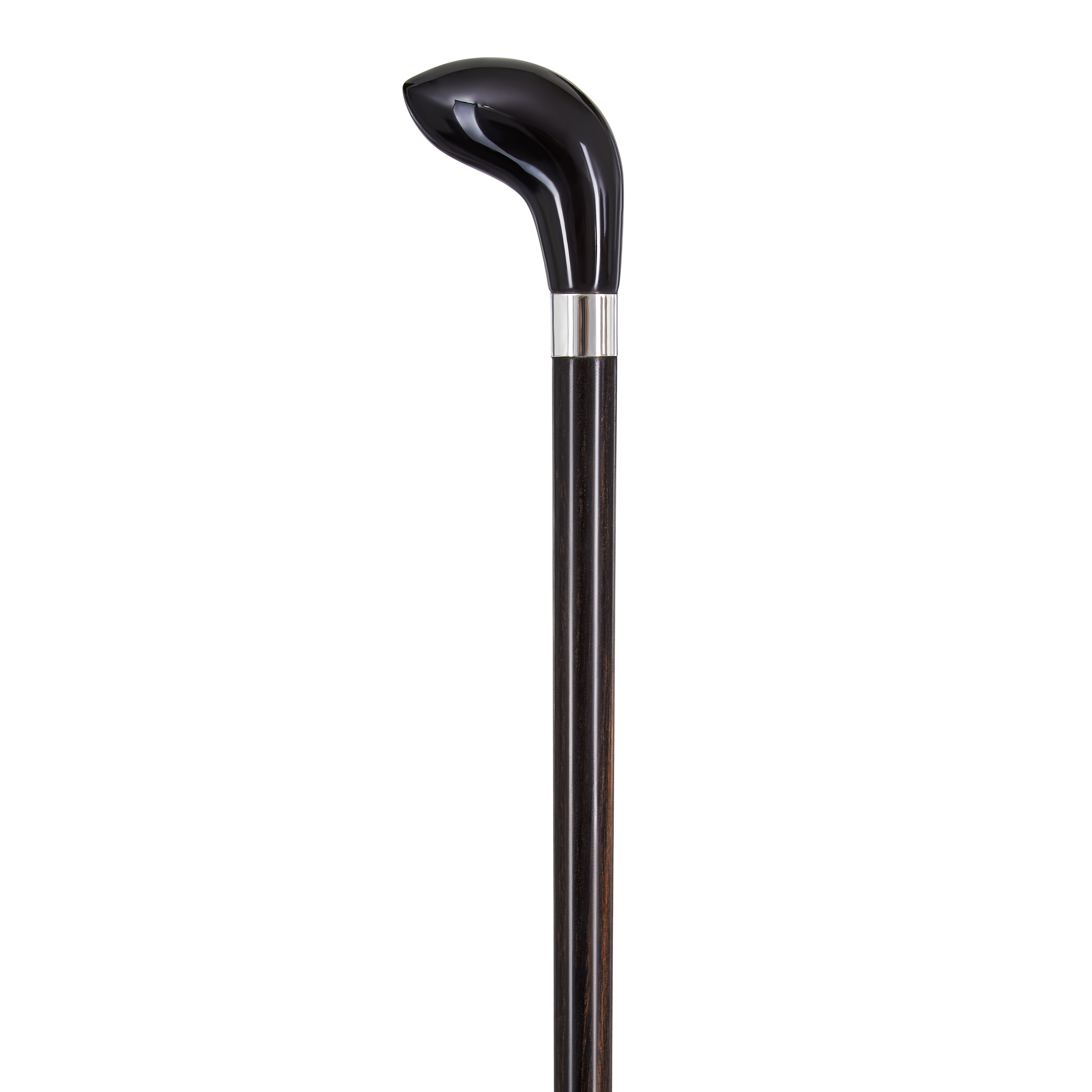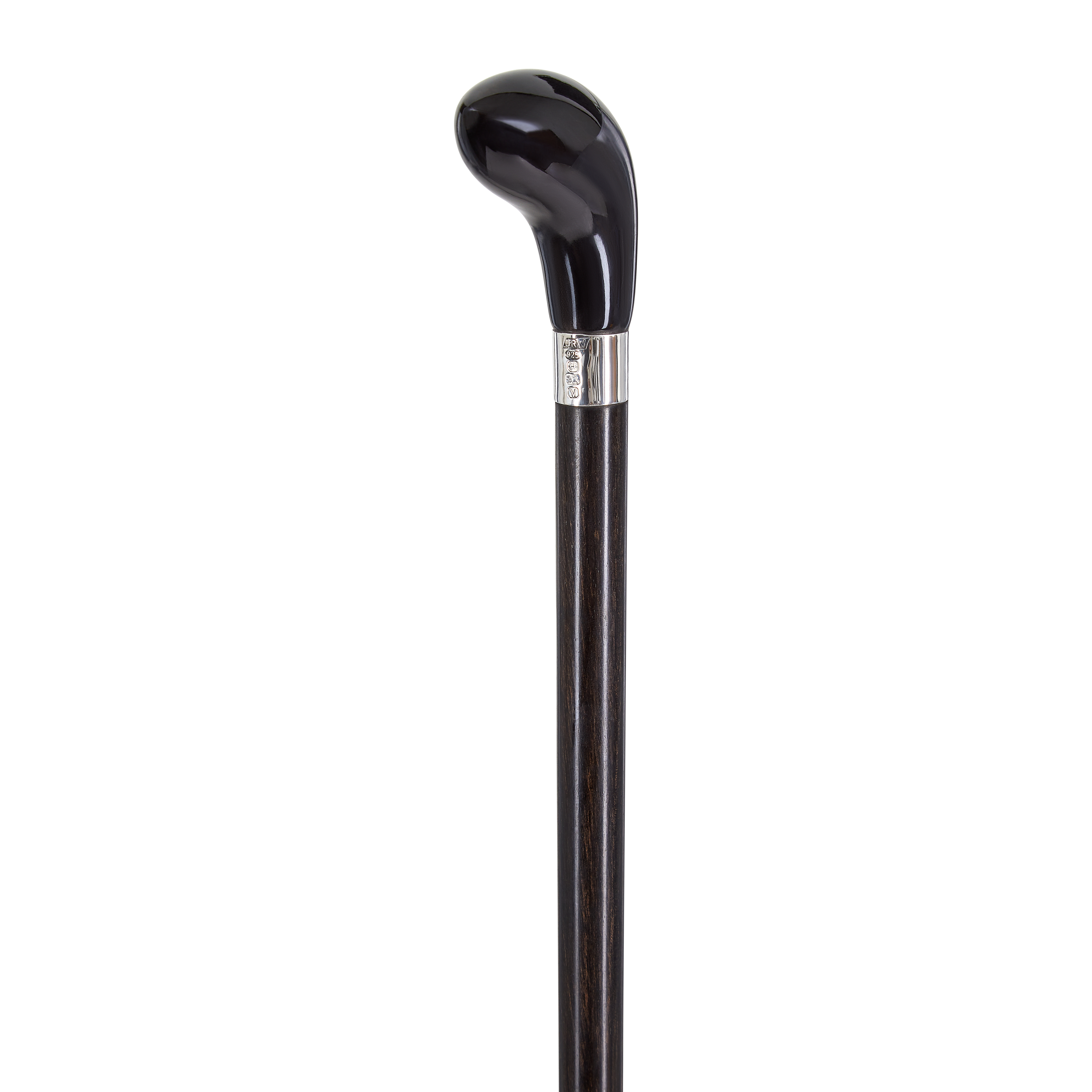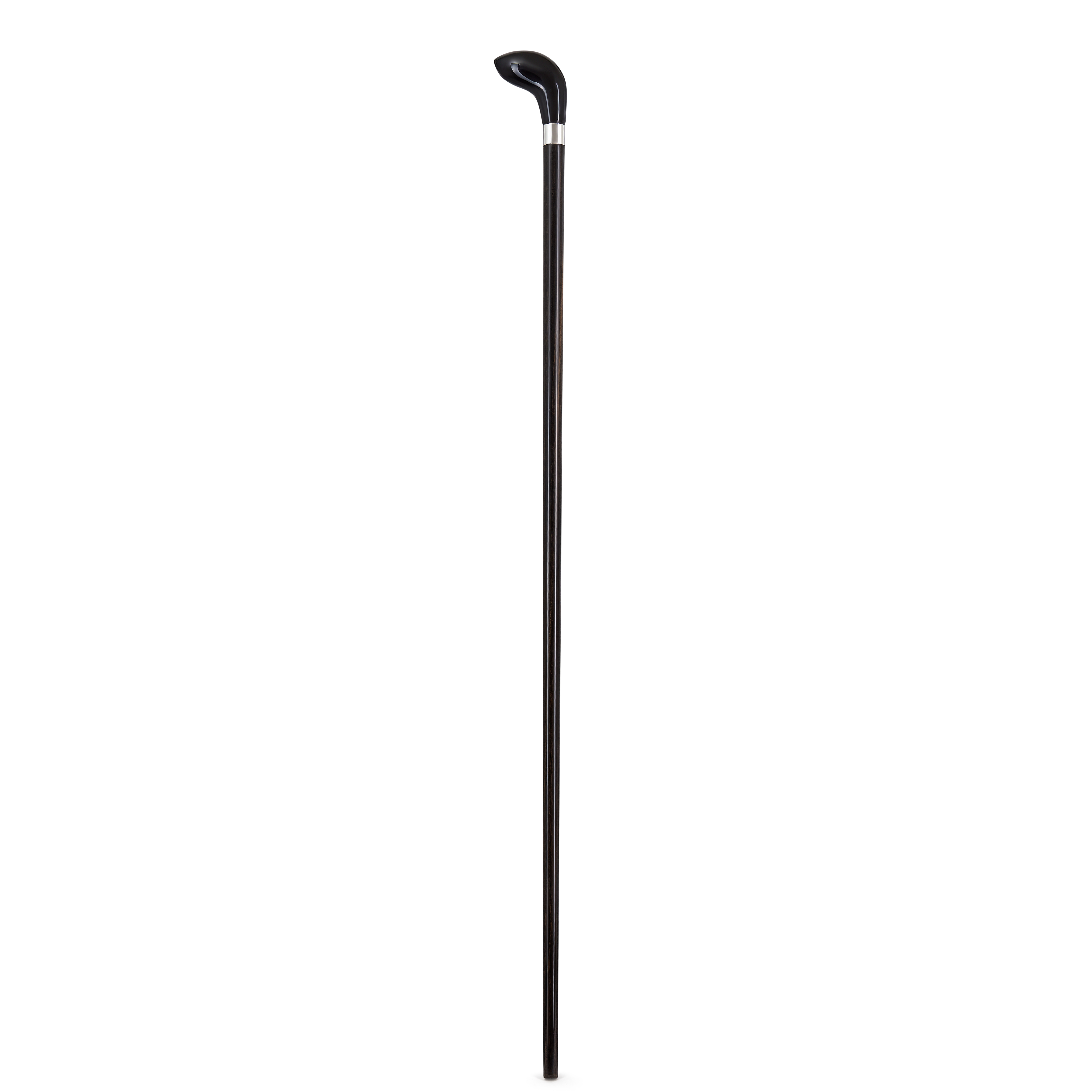 ‘Pistol Butt’ handle in black buffalo horn on West African ebony, mounted with Sterling Silver Collar. This walking stick can be cut to the appropriate length for the user and will be finished with a brass ferrule. A rubber ferrule will also be provided for additional grip on hard surfaces.